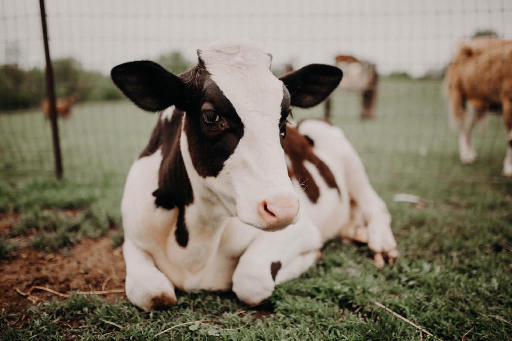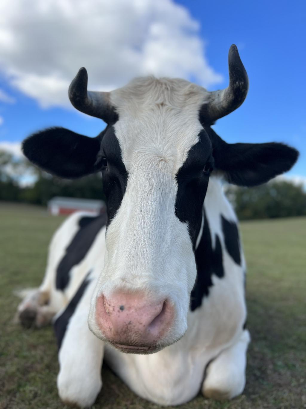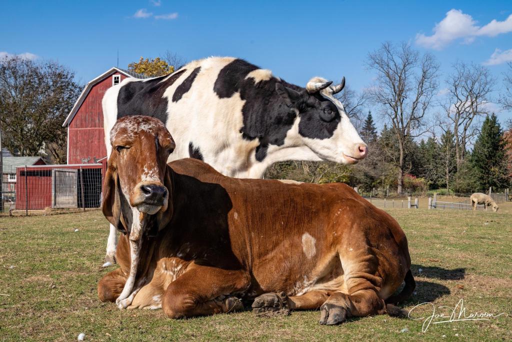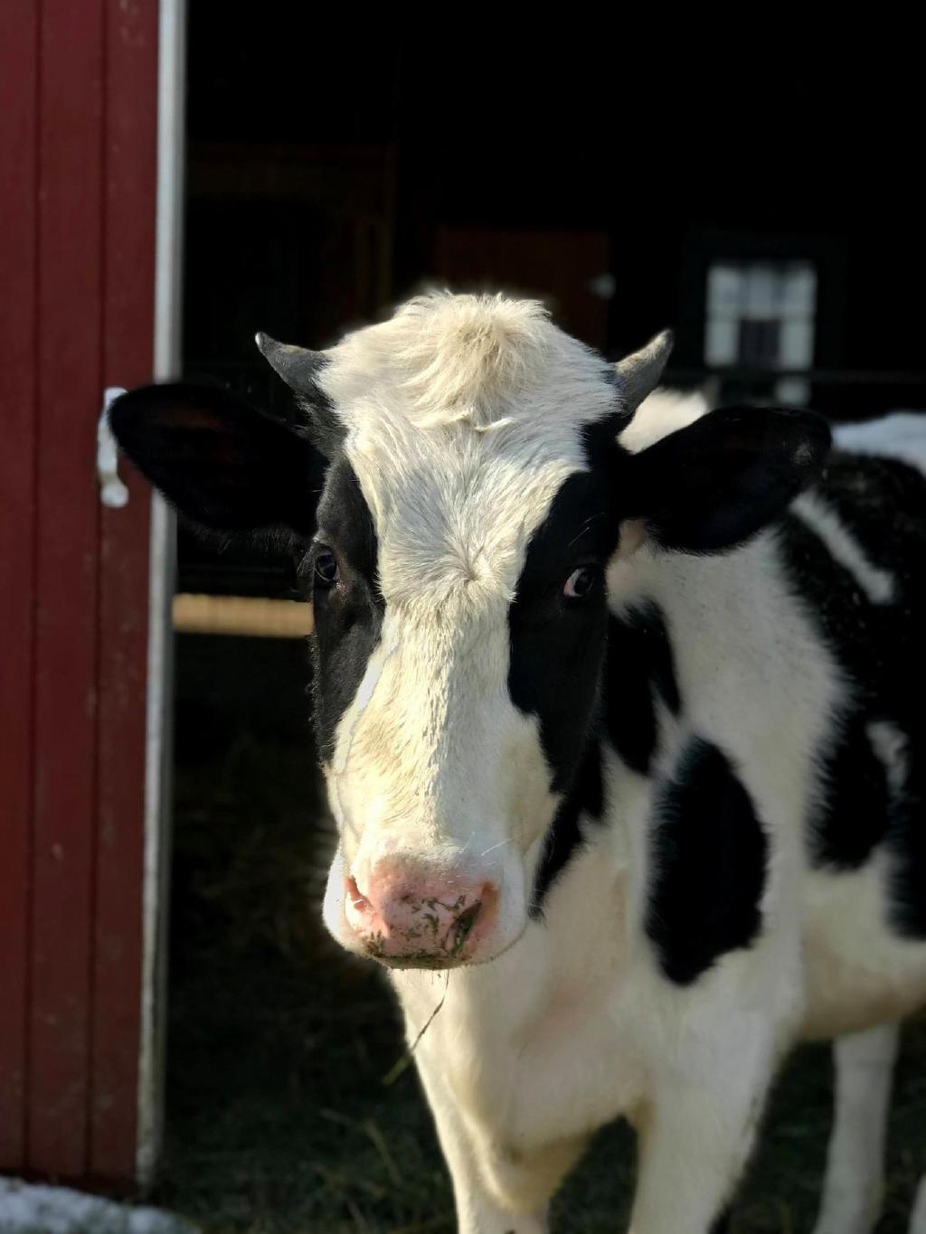 Daisy Belle is a female Holstein, born on a dairy farm. She was born with a male twin. The male was removed by the farmer to be raised and sold for meat, but Daisy Belle was found to be sterile, in addition to having congenital cataracts. She was put in a pen, not fed, and left to die. A kindly neighbor convinced the farmer to let her take the calf. Daisy Belle arrived at SASHA at the age of only three weeks and was bottle fed for many months. She had many health issues, including pneumonia. Although she will always be small, she has regained her health and is very playful and curious about everything around her. Although she will always be little lamb (now grown up sheep) Suzy’s best friend, she now runs in the pasture with the “big boys” Bhima and the Jersey Five and really holds her own!