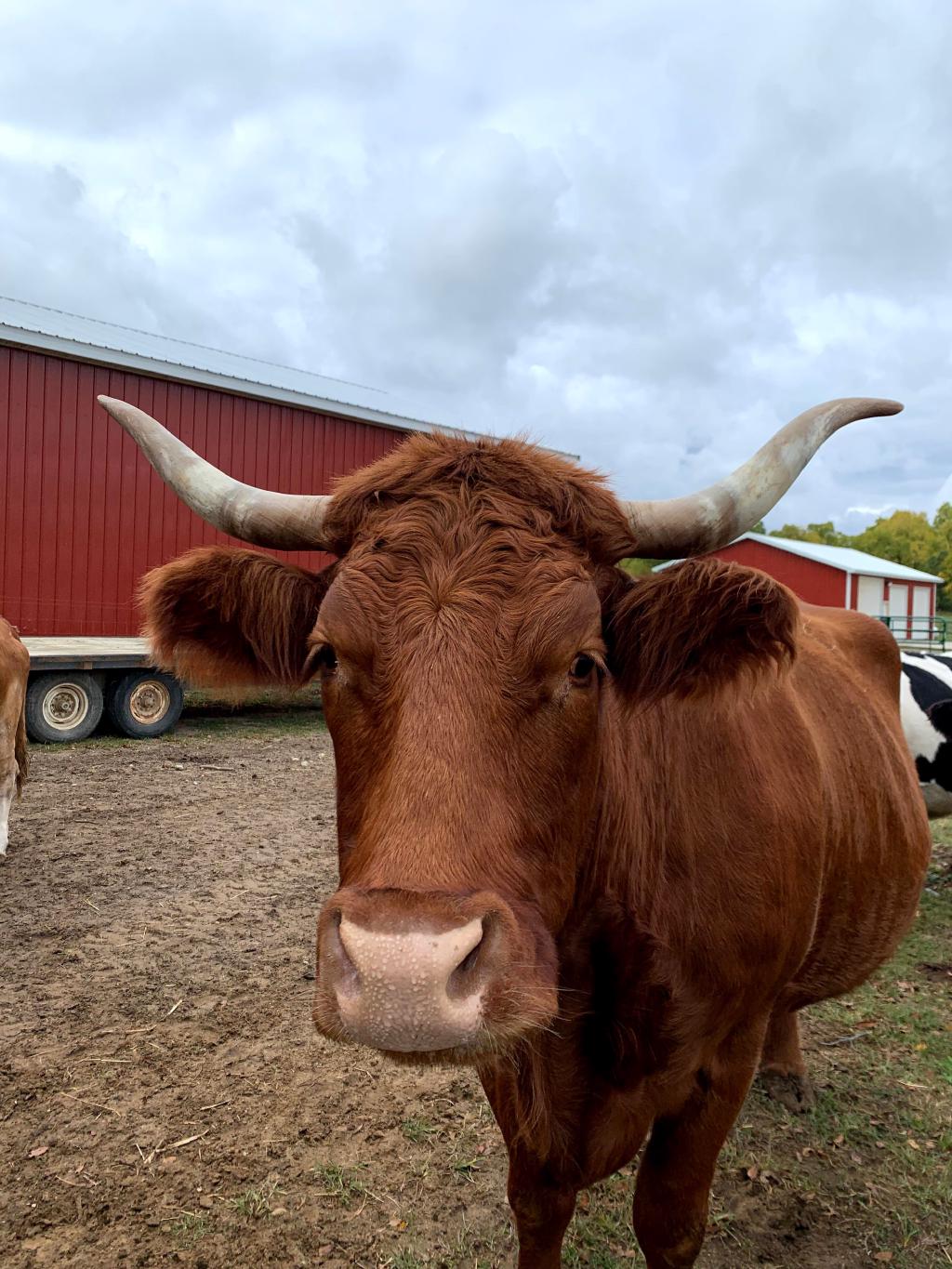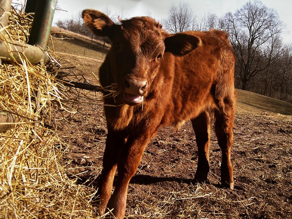 Mr. Rogers is a magnificent looking Salers/Red Angus mixed breed, brown-ish red, with rather small horns. He was born at SASHA Farm on August 20, 2010, one week after his mother Bella escaped a transport truck packed with cows on their way to be slaughtered. Bella survived the crash and ran off. Monte Jackson and Bob Harvie from SASHA were called in to help, and they picked her up near Grand Rapids, MI. She joined the SASHA Family the next day, very thin and hardly able to walk. At the time she was pregnant, but no one was aware of her pregnancy.